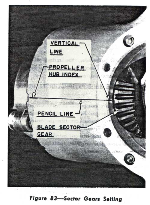 (d) SETTING OF BLADE SECTOR GEAR.As the propeller blade is rotated into high pitch angle, the leading edge of third tooth of each blade sector gear is brought up to vertical center line as explained in paragraph (7)(~c), this Section. (See Fig. 83.)